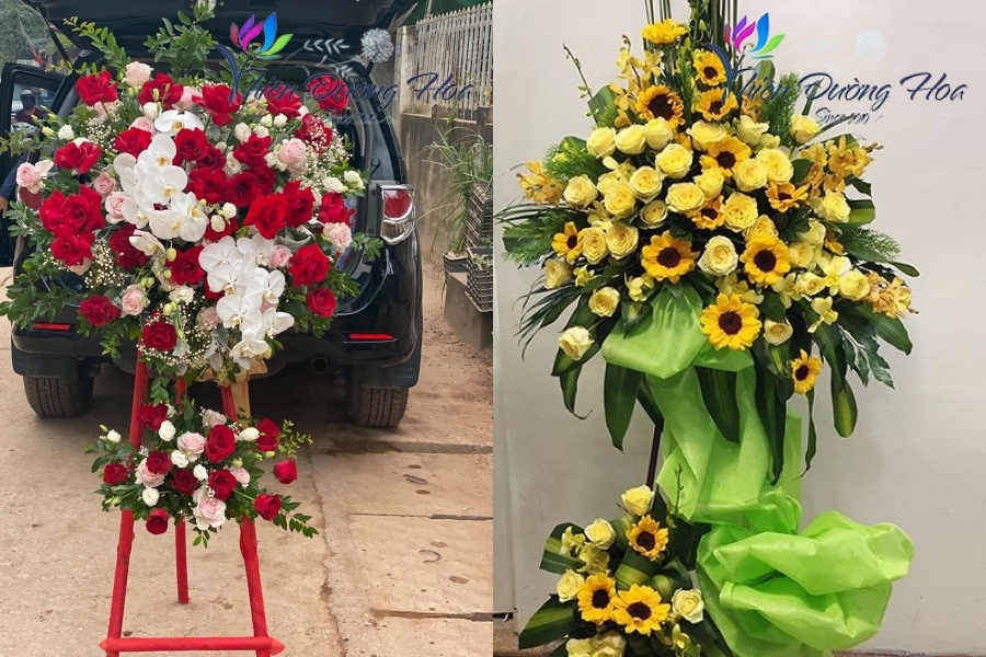 - Kệ hoa đứng (Flower Stand): Biểu tượng của sự hoành tráng và lời chúc "Khai trương hồng phát". Các kệ hoa 1 tầng, 2 tầng tại shop hoa Bình Dương chúng tôi luôn là tâm điểm của mọi buổi lễ khởi công, khánh thành.