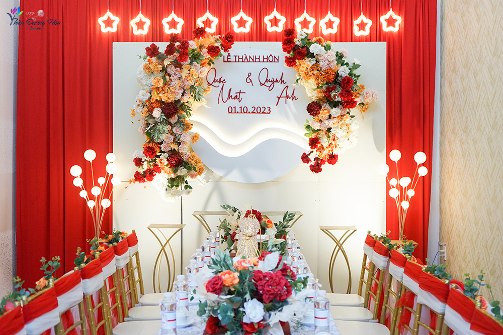 Phông màn (Backdrop): Sử dụng vải voan cao cấp hoặc các tấm CNC hiện đại, đính chữ "Hỷ" trang trọng.