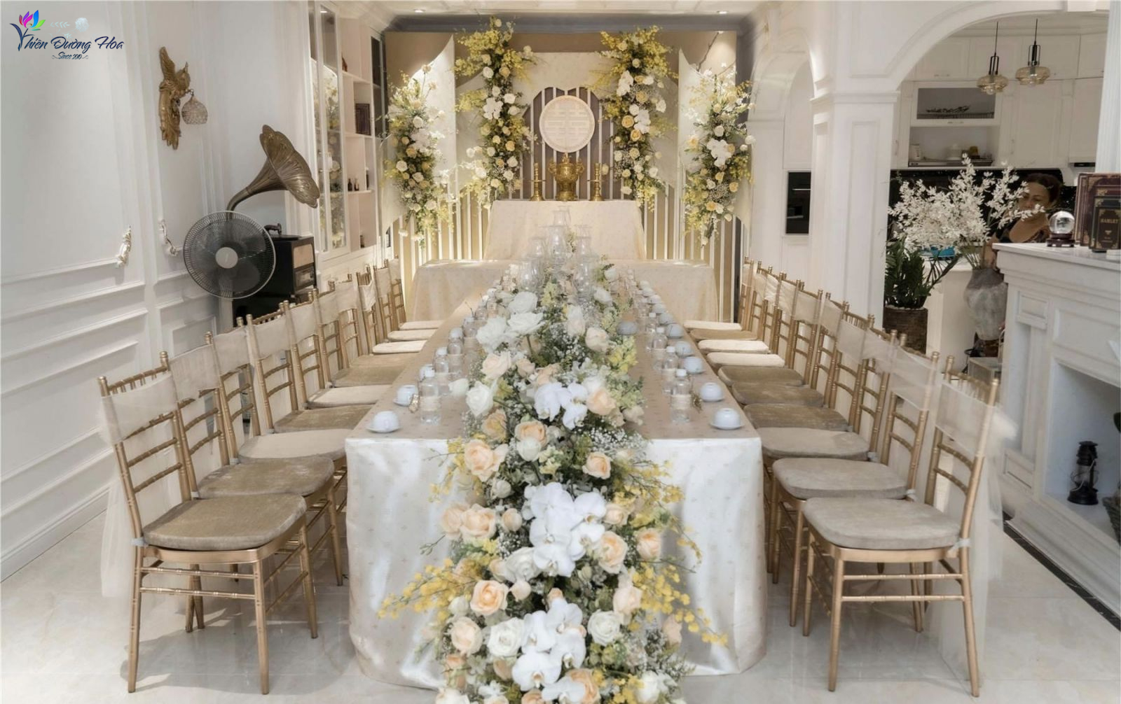 Cá nhân hóa phong cách: Với hoa tươi, Thiên Đường Hoa có thể linh hoạt thiết kế theo yêu cầu riêng, phù hợp với tone màu chủ đạo của đám cưới.